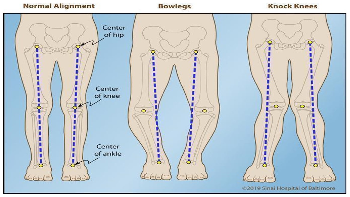 Figure 1 The image shows the comparative alignment of the legs, highlighting bowlegs, normal legs, and knock knees. It illustrates the inward angulation of the femur and tibia in knock knees, the outward angulation in bowlegs, and the proper alignment in normal legs, helping to visualize the differences in joint structure and stability“Knock Knees.” Limblength.org, www.limblength.org/conditions/knock-knees/. Accessed 22 Mar. 2025.