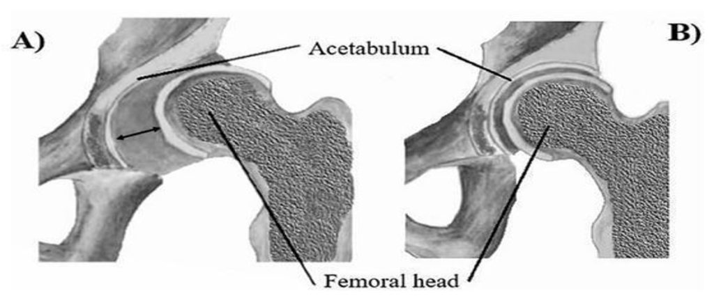 Figure 2. (A) Dysplastic acetabulum with a subluxated femoral head, showing insufficient coverage. (B) Normal acetabulum with proper femoral head coverage, demonstrating stable hip alignment.Source: Pavelka, K., and T. Loutocký. “Developmental Dysplasia of the Hip: A Review of Etiopathogenesis, Risk Factors, and Genetic Aspects.” Medicina, vol. 56, no. 4, 2023, p. 153. https://doi.org/10.3390/medicina56040153.