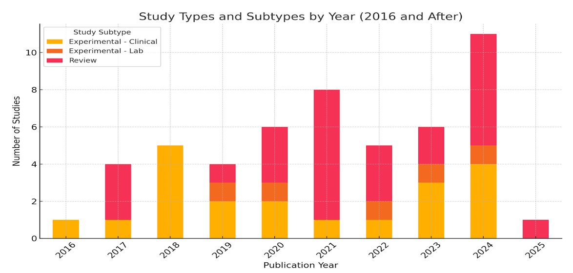 Figure 3. Annual distribution of studies on 3D-printed hip implants from 2016 to 2025, categorized by study subtype. Clinical experimental studies have notably increased in recent years, particularly in 2023, reflecting a shift from theoretical reviews to practical, data-driven evaluations. This trend demonstrates the growing emphasis on real-world application and patient-centered outcomes in orthopedic 3D printing research. Chart generated from synthesized review data of 63 peer-reviewed publications on PubMed.
