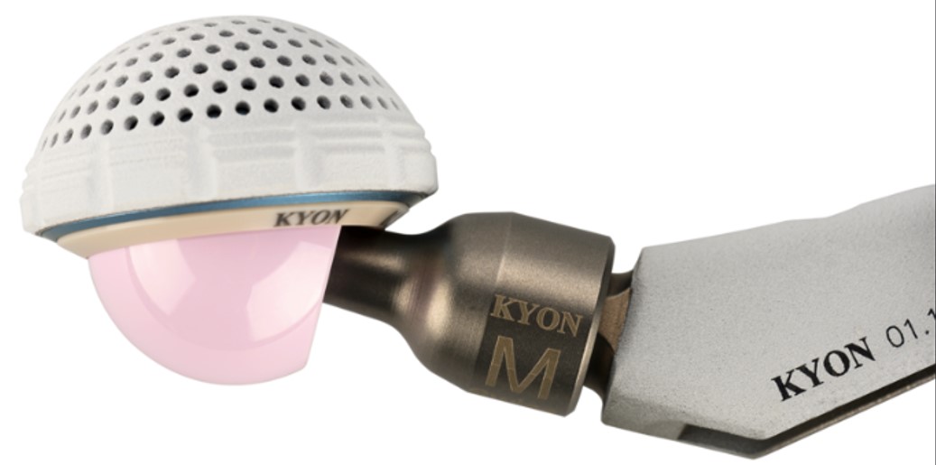 Figure 4. Example of a hip implant using a polyether ether ketone (PEEK) acetabular cup and femoral head, designed for biocompatibility and reduced wear. PEEK’s radiolucency and low weight make it suitable for applications requiring frequent imaging and patient-specific customization.Source: KYON. “Total Hip Replacement Implant with PEEK Components.” https://www.kyon.ch/products/total-hip-replacement