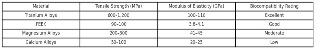 Figure 5. Comparative mechanical and biological properties of common materials used in 3D-printed hip implants. Titanium alloys exhibit the highest tensile strength and biocompatibility, while emerging materials like PEEK and biodegradable metals (e.g., magnesium and calcium alloys) offer advantages in imaging compatibility and resorbability, respectively.
