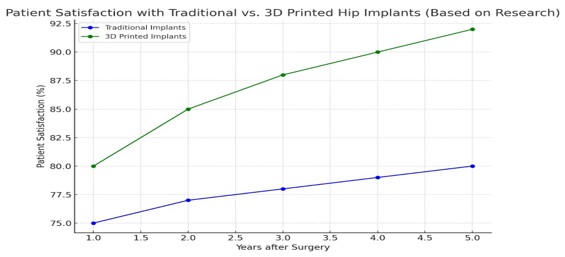 Figure 6. Comparison of patient satisfaction rates between traditional and 3D-printed hip implants over a five-year period. Studies consistently report higher satisfaction in patients who received custom 3D-printed implants, attributed to improved anatomical fit and reduced post-surgical discomfort96.