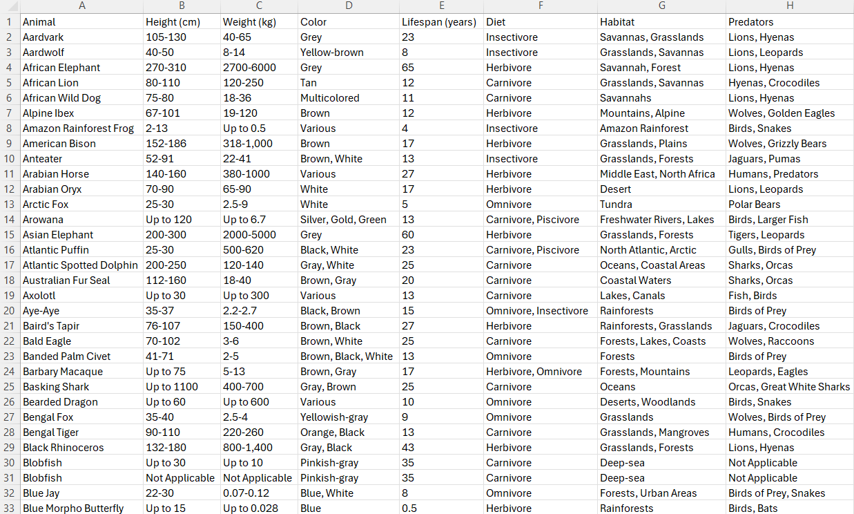 - “Animal Information Dataset.” Kaggle, 20 Sept. (2023), www.kaggle.com/datasets/iamsouravbanerjee/animal-information-dataset. [↩]