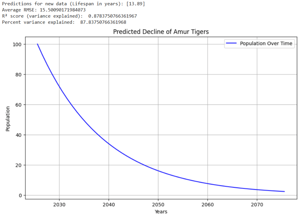 The mean squared error is a way of quantifying the overall error of the model. To do this, it averages the squared differences between the predicted and actual values of the model. By utilizing sklearn’s cross_val_score function, we were able to calculate the RMSE value for both species. This was done by performing 10-fold cross-validation and computing the negative mean squared average for each fold, before averaging those results and taking the square root to obtain the RMSE16,18,19,20. For the Amur Tigers and Alaotra Grebe graphs that are shown in the Results section of this paper, the RMSE values of 2.94 and 8.85 were obtained respectively. Considering the lifespan range in the dataset spanned from 0.25 to 125 years, an error of 2.94 and 8.85 years is a relatively small portion of the total range. This suggests that the model performs well when predicting species lifespans.