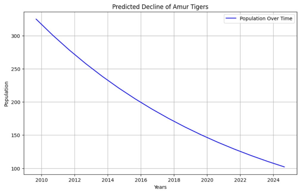 This graph shows that by following the trend of their population 15 years ago (325 Amur Tigers), a prediction can be made for the present day: there should be roughly 100 tigers left.