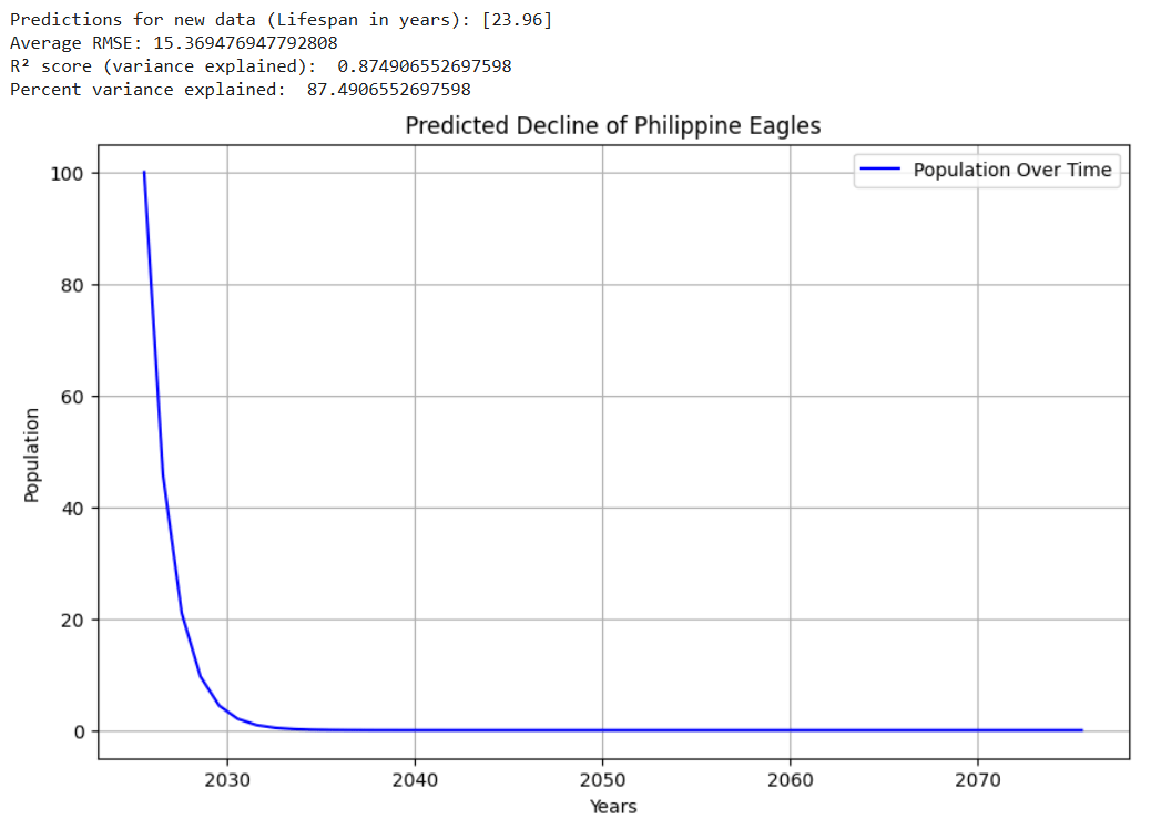 As shown by the data, it is possible to create a general model that can predict the lifespans, population, and extinction risk of species. It was possible to decide which model was the most effective by running practice simulations and testing. By training the model with data that was preprocessed, predictions were made on the lifespan, population numbers, and extinction risk of declining species. Finally, it was possible to cross-check the work by running an additional series of tests to validate the findings.