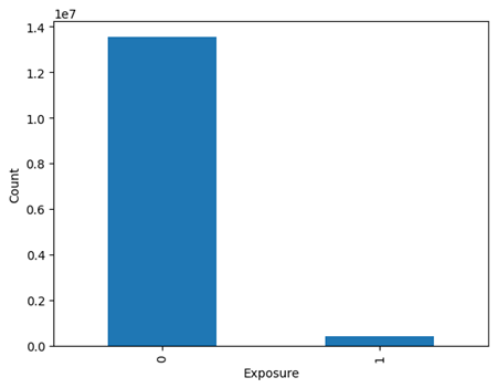Figure 2 illustrates how many of the subjects have been exposed, with those labeled with a 0 being unexposed, and those with a 1 being considered as exposed. When taking a closer look at the actual distributions, around 13.5 million data values are considered to be unexposed, and only 400 thousand data values are actually exposed. In percentages, approximately 96.9% of the data values were unexposed, while around 3.1% of the data values were exposed. The massive data imbalance poses the large issue of model bias, affecting accuracy of the model in the process. Although this data imbalance is startling, considering the size of the dataset, the minority class will still have 400 thousand data values.