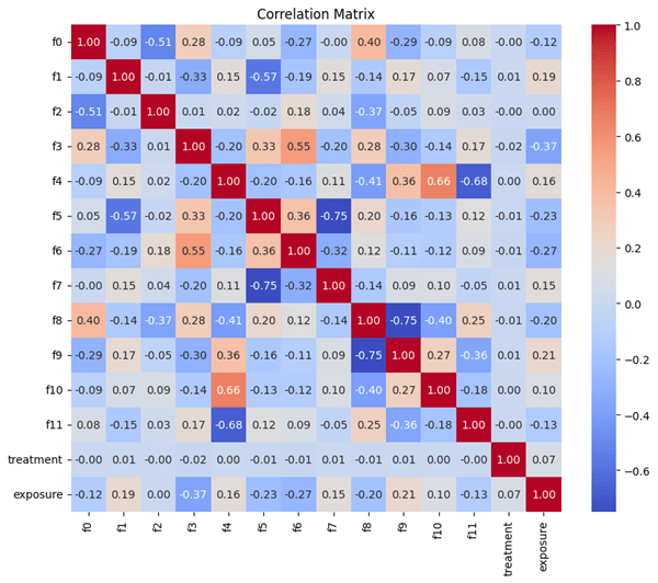 To understand the relationships between the variables, we computed the Pearson’s correlation coefficient between the variables as shown in Figure 4. A perfectly positive correlation (both variables are perfectly linearly related) occurs at a correlation value of 1, while a perfectly negative correlation (both variables are perfectly inversely related) at -1. We note that there is an extremely low coefficient value between treatment and any other variable in the dataset. However, we observed two relatively highly correlated feature pairs such as with f8 and f9 (-0.75), f5 and f7 pairs (-0.75). Although the correlation coefficients are relatively high, they do not cross the threshold of +/- 0.8 which we deemed to be an implication of collinearity. When taking a look at the target variable of the model, no variables were particularly high when correlated, with the highest values being f3 at -0.37 and f6 at -0.27.