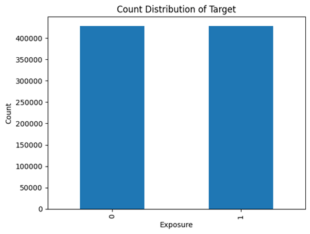 For undersampling, the imbalance with the vast majority of data values not being effectively exposed was randomly undersampled to set the amount of data values which were exposed and unexposed close to equal, as revealed by the large disparity shown in the exploratory data analysis section. The method chosen for undersampling is random undersampling, which randomly deletes data values in the original data set from the majority class as to even out the value counts, a visualization of the results is visualized in Figure 5, where both exposed and unexposed value counts equal approximately 400 thousand. Although undersampling removed ~97% of the 25 M rows, this was necessary given the dataset’s extreme imbalance and redundancy. Alternatives such as cost‑sensitive learning with weighted XGBoost preserved scale but failed to match the uplift gains from undersampling. The discarded examples were largely repetitive majority‑class instances adding little causal signal, while the reduced dataset improved convergence, cut computation, and delivered superior uplift performance. Thus, in terms of this dataset, scale alone, praised in prior Criteo studies, does not outweigh precision.