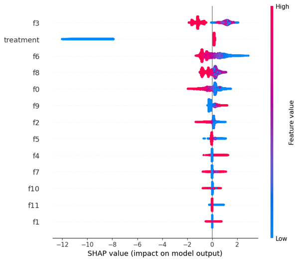 With an understanding of the optimal model, an investigation of feature importance and a deeper understanding of the dataset will be conducted primarily through SHAP analysis. This will be based on the optimal model found during previous experimentation. While SHAP analysis will illustrate the importance of each feature when determining exposure effectiveness, the encryption of what the feature values represents prohibits this study from giving precise interpretation. Future study may find this an area to improve and create further insight. Figure 6 presents a SHAP summary plot that illustrates the influence of individual features on the model’s output by showing the spread of SHAP values for each feature. Each point represents a prediction and is colored by the feature value (red for higher values, blue for lower values), while the horizontal axis measures the SHAP value, indicating both the sign and strength of a feature’s effect on the model’s prediction. The treatment feature stands out with a marked negative impact, as evidenced by a dense cluster of blue points located far to the left, suggesting that a lack of treatment sharply decrease the predicted outcome. In contrast, features such as f0 exhibit a broader distribution with more red points to the right, indicating a tendency for high f0 values to positively influence the prediction. This detailed visualization provides insight into how specific feature values guide the model’s output, uncovers possible non-linear effects and feature interactions, and helps identify outliers or unusually influential data points that may disproportionately sway the model’s decisions.
