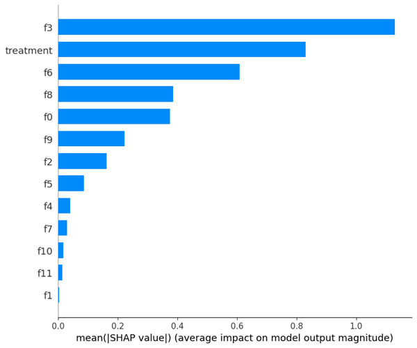 Figure 7 illustrates SHAP summary plot that provides a high-level overview of feature importance by displaying the mean absolute SHAP values for each feature. The length of each bar represents the average impact of a feature on the model’s output, with longer bars indicating greater importance. Feature f3 stands out as the most influential, followed by “treatment” and f6, suggesting their importance to the model relative to other feature values. Conversely, features like f10, f11, and f1 exhibit minimal impact, indicating their limited contribution to the model’s output. This visualization aids in understanding the relative importance of features, guiding feature selection, and revealing underlying data relationships, ultimately enhancing model interpretability and potential refinement. In this figure, no highly correlated pair seem to be apparent, rather the elements of these pairs show up independently, not leading to any conclusions of correlation between specific feature variables.