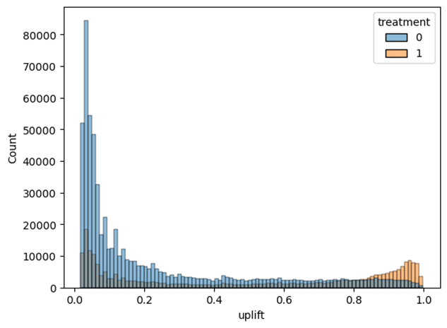 Figure 8 shows the distribution of uplift scores generated by the two-model framework and calculated by subtracting treatment group score by the control group score, trained exclusively on the treated subset and evaluated on the test dataset. The x-axis represents predicted uplift, the estimated increase in probability of exposure due to treatment, and the y-axis represents the number of samples per uplift score. The treated distribution visualizes a range of uplift values containing a noticeable tail of treated high uplift data values, indicating a subset of data values are predicted to have a substantial positive response to treatment. The treated distribution does not resemble a normal distribution, as would be expected from a non-discriminative model, but rather demonstrates the model’s capability of assigning differentiated uplift scores across the population.