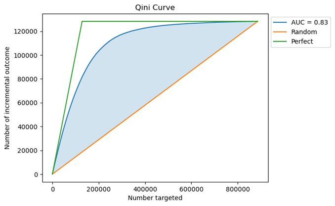 To further evaluate model effectiveness, a Qini curve was analyzed, as shown in Figure 9. The Qini curve illustrates the cumulative uplift gained as an increasing portion of the population—ranked by predicted uplift score—is targeted. The steep initial rise of the curve suggests that the model effectively identifies and prioritizes individuals most sensitive to treatment, enabling strategic allocation of marketing resources. The curve then gradually plateaus, indicating diminishing marginal returns as lower-ranked individuals are targeted. The Area Under the Qini Curve (AUC) was calculated to be 0.83, reflecting strong model performance. This high AUC value demonstrates that the model is not only able to distinguish high responders early but also sustains uplift across a the population.