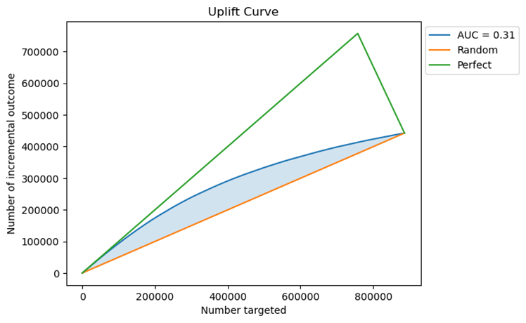 Figure 10 displays the uplift curve for the two-model XGBoost framework, which visualizes the number of incremental outcomes achieved as progressively more individuals are included. The area between the model curve and the random baseline, shaded in blue, yields an Area Under the Uplift Curve (AUUC) of 0.31, indicating effectiveness in identifying users who respond positively to treatment. While not ideal, this AUUC reflects a meaningful gain in targeting efficiency compared to random selection, especially in the early portion of the curve where uplift gains rise rapidly. The divergence between the model and random lines confirms that the model successfully distinguishes high-impact individuals, although the gap from the perfect model suggests room for further refinement or feature enhancement.