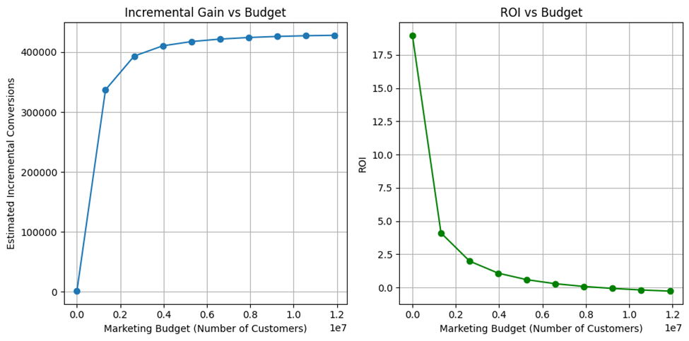 Beyond conventional classification and uplift metrics, we assessed business impact through a simulated budget allocation analysis based off the overall highest performing model, happening to be the undersampled single model approach, specifically with random forest. Customers were ranked by predicted uplift scores, and budget was incrementally allocated from the highest-ranked segments downward. At each level, we measured incremental conversions and ROI, defined as conversions per unit cost. As shown in Figure 11, the Incremental Gain vs. Budget curve indicates that over 80% of incremental conversions can be achieved by targeting only the top ~20% of customers. The ROI vs. Budget curve peaks at low budgets and declines as lower-ranked customers are included, reflecting diminishing marginal returns. These results confirm that the framework not only isolates high-response segments but also provides clear guidance for maximizing ROI through optimal budget allocation. When benchmarked against two-model uplift baselines such as T-learner and X-learner, the two-model approach also performed significantly better. Both baselines performed similar to their single-model counterparts, with negative Qini AUC and uplift AUC values.