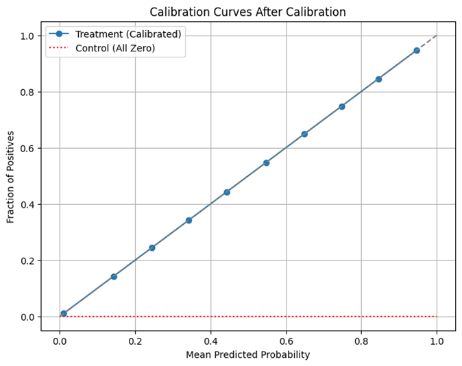 We specifically evaluated calibration of predicted uplift scores to ensure reliability for decision-making. Figures 12 and 13 show pre‑calibration and post‑calibration curves29, with the calibrated model aligning closely to the diagonal, indicating well‑calibrated probability estimates. The Brier score loss for the calibrated treatment model was 0.0242, reflecting high probability accuracy. These scores represent calibrated differences in predicted treatment and control probabilities, making them directly interpretable for targeting decisions in practice. This calibration step ensures the model’s uplift scores are statistically reliable and suitable for real‑world deployment scenarios.