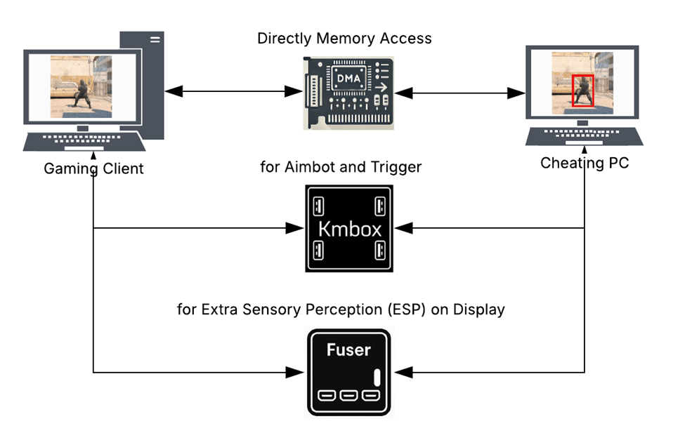 The software cheating approach is more traditional and usually involves running a model on the client’s computer that utilizes advanced machine learning to detect objects and draw a visual component for the game as seen by the player that differs from what honest players will see on their screen5. Figure 1–as seen below–displays a simple explanation on how software cheats function. Already, many solutions to combat software cheating have been developed since it is relatively easier to detect and prevent. However, the hardware approach to cheating is a newer trend and much harder to detect6‘7‘8‘9‘10‘11.