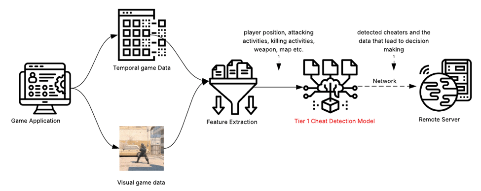 - Tier 1: Lightweight machine learning model driven cheat detection based on players’ action, statistics data and sensory perception data in the current playing session.