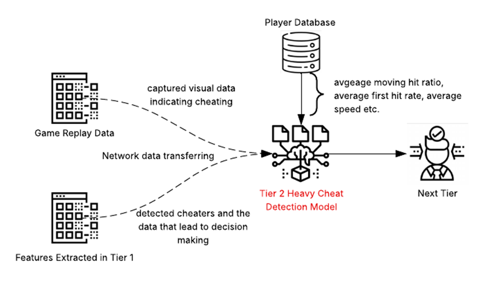As seen in Figure 4, Tier 2 receives the game replay data and extracted features from Tier 1, but also obtains the player’s historical data (such as killing statistics and level-up times) from the player account database and takes them into account during decision making. The historical data allows the model in Tier 2 to identify and flag sudden anomalies like rabid skill increases or unusually fast progress through competitive ranks. The model in Tier 2 will also be able to perform complex vision data analysis on the replay data for further assessment.
