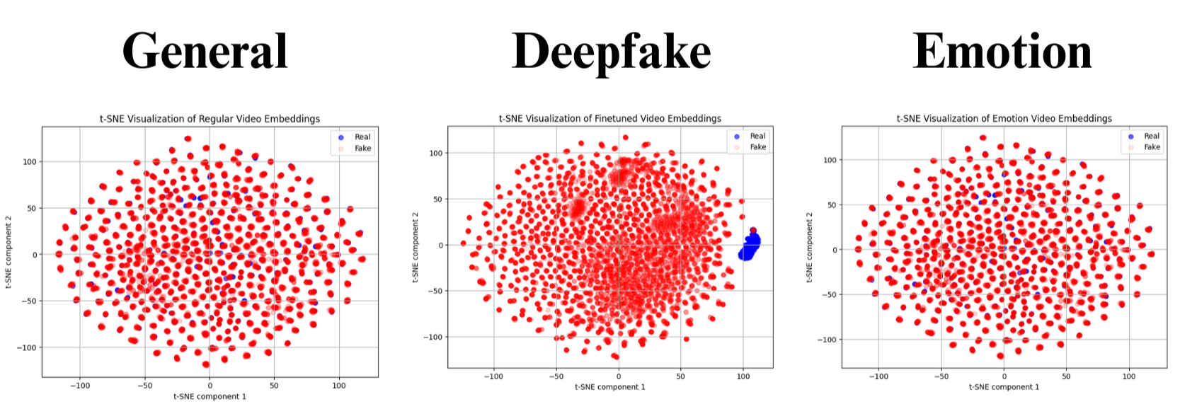 Fig. 8 In the t-SNE visualizations of general, deepfake, and emotion video embeddings, each blue dot represents one real sample, and each red dot represents one deepfake sample. Only the deepfake embeddings had clear separation between these two colors/classes.