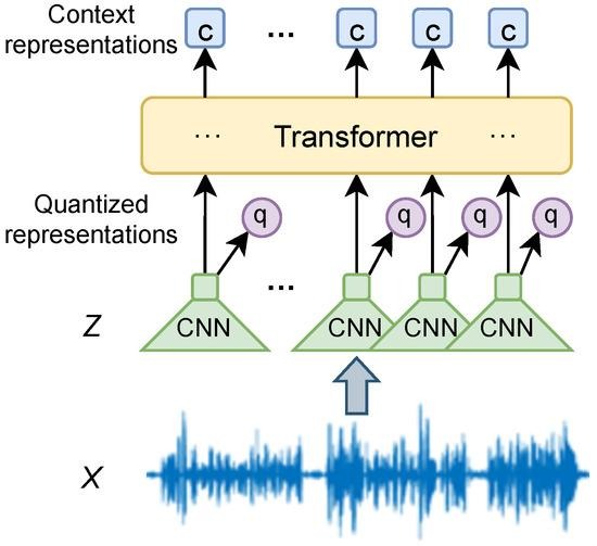 Fig. 3 In wav2vec 2.0, raw audio is encoded by a CNN into latent speech representations. These representations are passed through a transformer to produce contextualized embeddings. Image licensed under Creative Commons Attribution 4.0 International license from https://www.mdpi.com/2079-9292/13/6/1103.