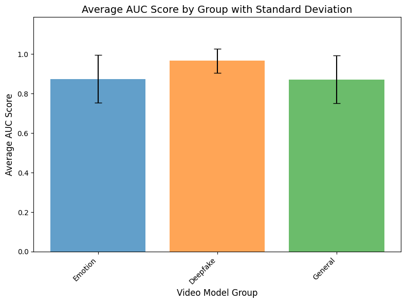 Fig. 10 displays the average AUC of the models created using each of the three types of embeddings. A Shapiro-Wilk test was significant (p < 0.001), indicating non-normality. As a result, the non-parametric Kruskal-Wallis test was conducted, showing a significant difference between at least two of the groups (p < 0.001). After this, a post-hoc Dunn’s test with the Bonferroni correction was performed for pairwise comparisons. The models created using deepfake embeddings had a significant difference in AUC compared to those created using general or emotion embeddings (both cases p < 0.001), suggesting that deepfake embeddings have superior performance. In addition, there was no significant difference between the AUC of the emotion models and the general models, implying that emotional features are ineffective for deepfake detection.