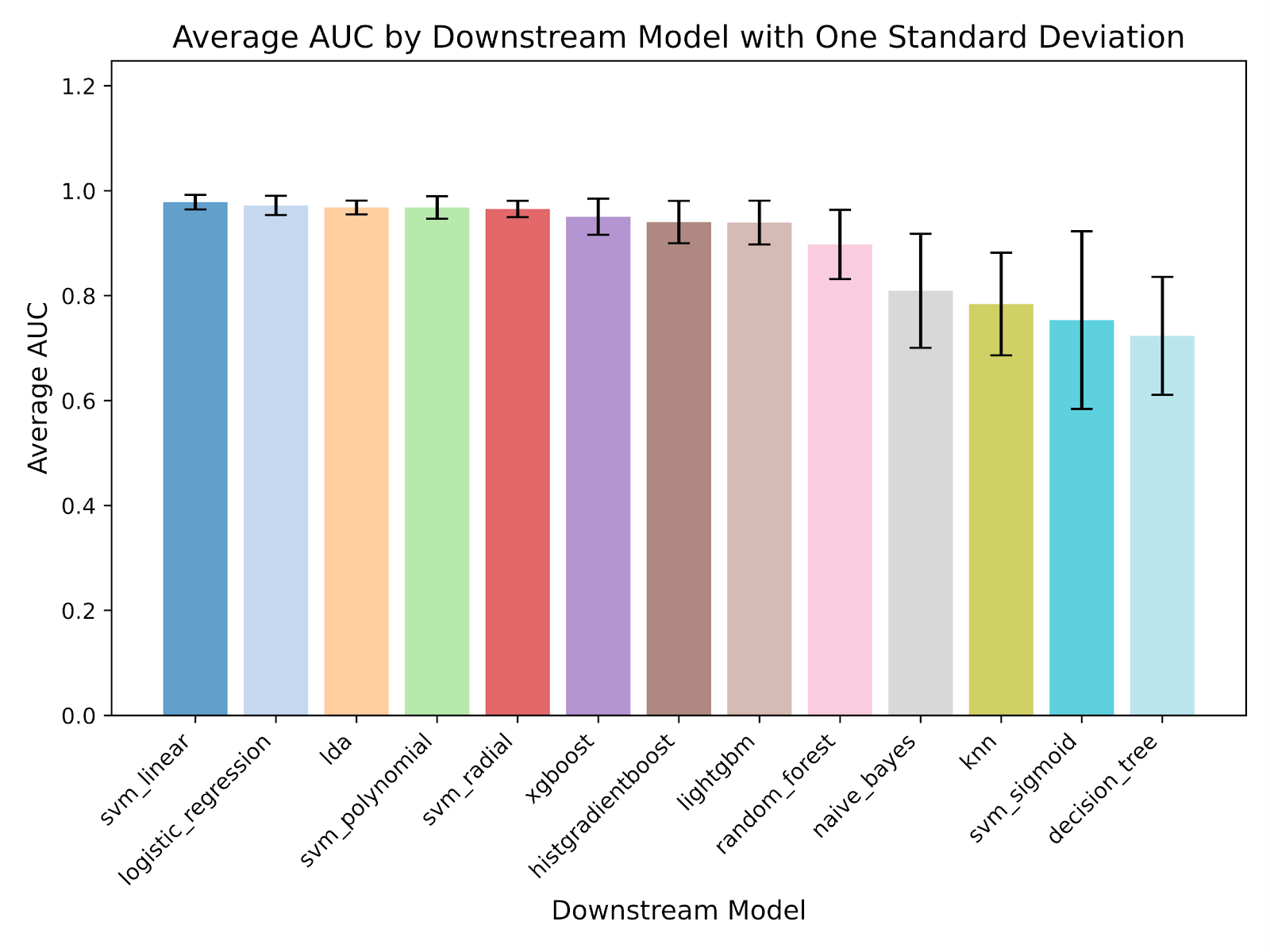 The performance of the different downstream model architectures was compared using a Kruskal-Wallis test and a post-hoc Dunn’s test with the Bonferroni correction on AUC.