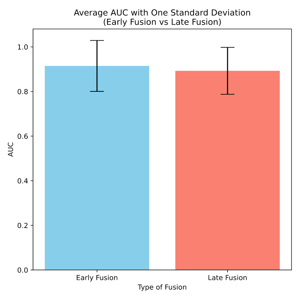 Fig. 9 shows the mean and one standard deviation of the AUC for the early fusion and late fusion models. A nonparametric Mann-Whitney U test was selected instead of a t-test because the data did not follow a normal distribution, supported by a significant Shapiro-Wilk test (p < 0.001). Using a significance level of p = 0.05, the Mann-Whitney U test was insignificant (p = 0.18), suggesting that the type of fusion method did not significantly affect model performance.
