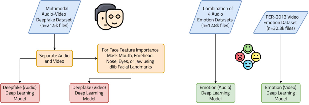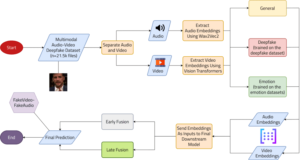 The ability of deep learning transformer models to generate vector embeddings provides an effective approach for integrating multimodal data for deepfake detection. For example, an image transformer model such as Vision Transformer can be used to extract image embeddings, while an audio transformer model like wav2vec 2.0 generates audio embeddings. Training these transformers on deepfake samples will significantly improve the quality of the generated embeddings. In addition, training on emotion datasets allows for the creation of emotion embeddings, which, like Mittal et al. (2020) demonstrated, have the potential to improve detection accuracy14. Combining these embeddings and feeding them into a downstream model enables the development of a robust multimodal system that leverages complementary information from both visual and auditory modalities. This is the first goal of this research: to incorporate both audio and video data into a deep-learning pipeline for deepfake detection.