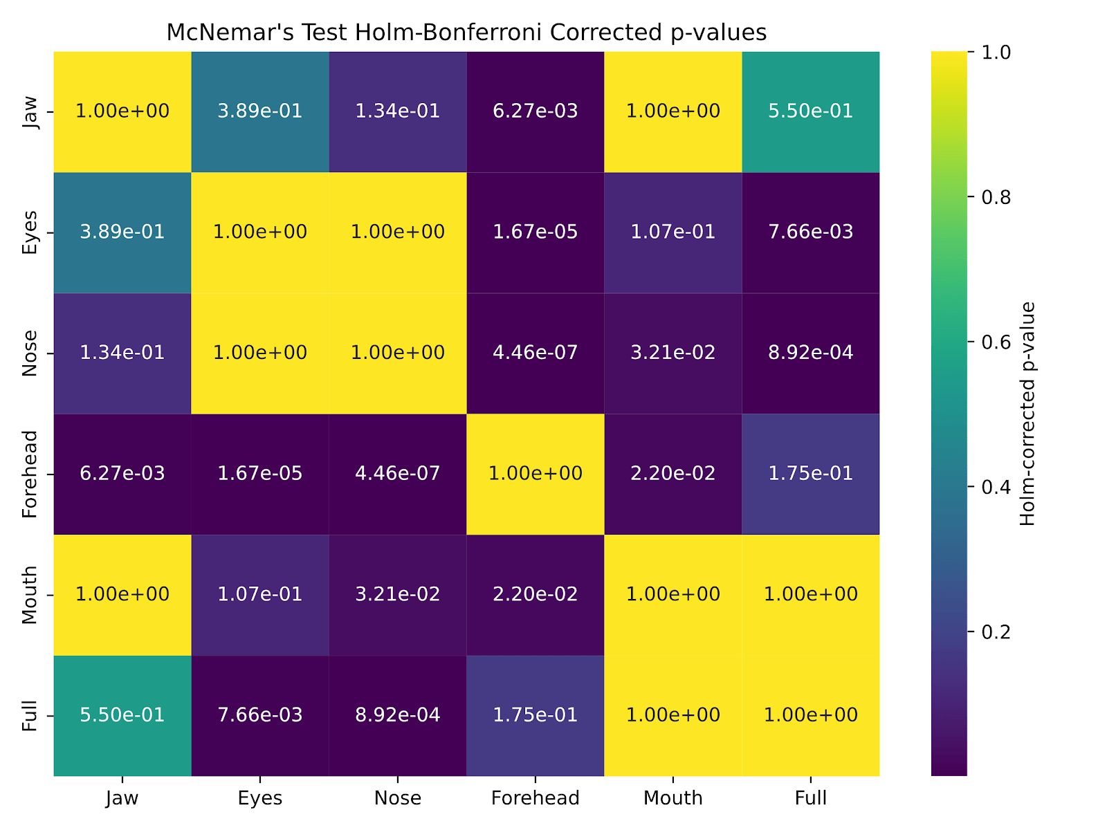 After blocking out the different face parts, as explained above in Part 1 of the model architecture, McNemar’s test with the Holm-Bonferroni correction was applied to determine whether there was a significant difference in accuracy between the full model and each of the blocked-out Vision Transformer models.