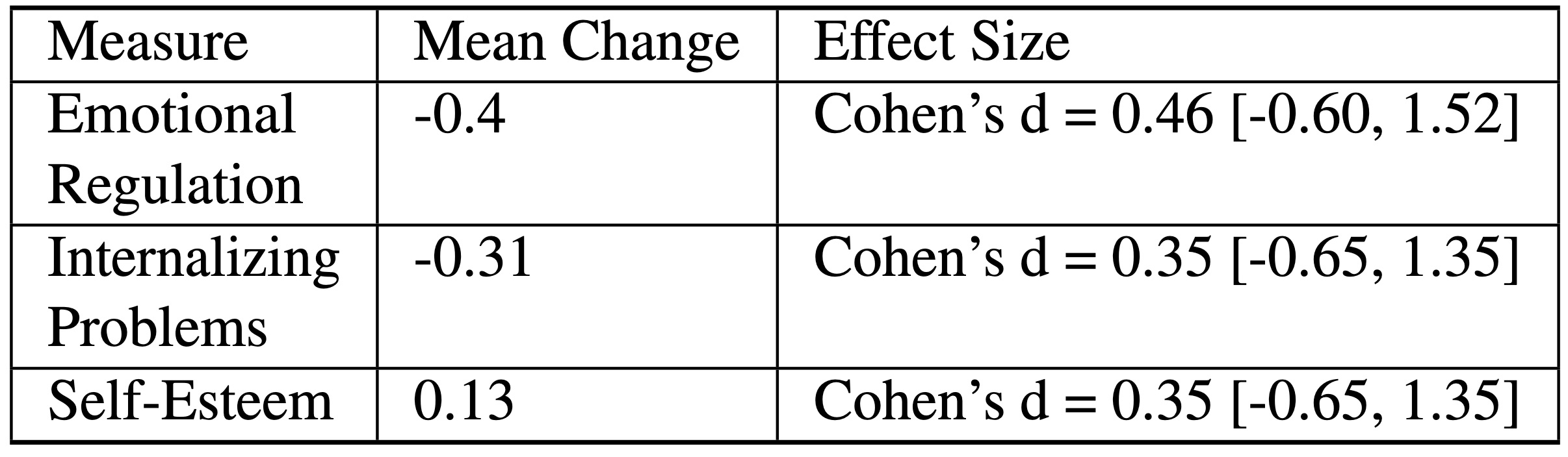 To examine changes in participants’ outcomes following the intervention, paired samples t-tests were conducted to compare Time 1 (baseline) and Time 5 (post-intervention) scores. For self-esteem, the analysis revealed no significant change from baseline to post-intervention (M difference = 0.125, t(3) = 0.70, p = 0.53, 95% CI [-0.45, 0.70]). Similarly, internalizing problems showed a non-significant trend toward improvement (M difference = 0.30, t(3) = 1.44, p = 0.25, 95% CI [-0.36, 0.96]), and emotional regulation demonstrated no significant change (M difference = 0.40, t(3) = 0.91, p = 0.43, 95% CI [-1.00, 1.80]). Despite the lack of statistical significance, the moderate effect sizes suggest potential intervention effects that might be detected with adequate statistical power (see Table 3).