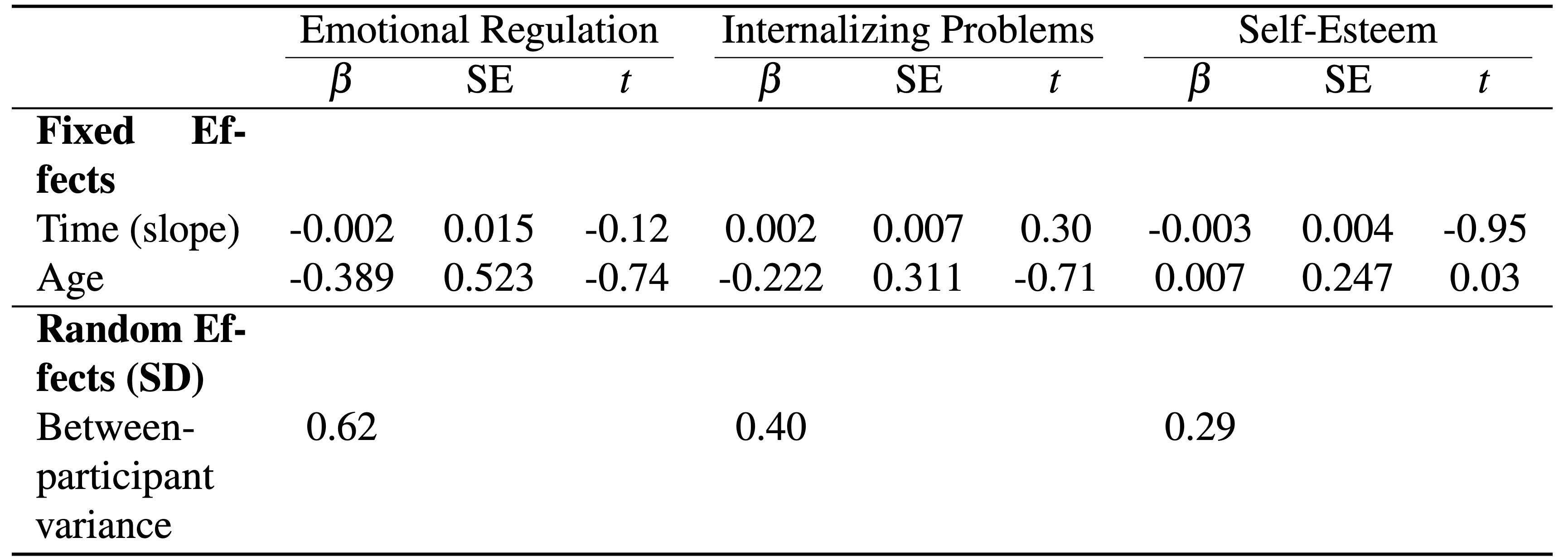 - ER_ij, SDQ_ij, and SE_ij represent emotional regulation, internalizing problems, and self-esteem scores for participant i at time j