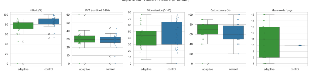 We first examined the pre-test cognitive measures to ensure the two groups were comparable prior to the learning intervention. As shown in Figure 1 (left three panels), the adaptive and control groups had no significant differences in their cognitive assessment results. The 2-Back working memory task accuracy was similar between groups (median values approximately 75–80% for adaptive vs. 85% for control, but with overlapping interquartile ranges). A two-sample t-test on 2-Back accuracy yielded no statistically significant difference (p > 0.1), confirming that both groups had equivalent working memory performance on average. The PVT vigilance results were likewise comparable: both groups exhibited a wide range of reaction times and lapses, but their overall vigilance scores (a composite scaled 0–100 combining reaction speed and lapses) did not significantly differ. Median PVT scores hovered around the mid-40s out of 100 for both conditions, with no statistical difference (p > 0.5). Similarly, sustained attention capacity as measured by the slideshow Attention Score showed no significant group difference (p > 0.2). The control group’s median attention score was around 60/100, slightly higher than the adaptive group’s median ~50, but the variance was large and scores ranged broadly in both groups (some individuals scoring above 70 and some below 30 in each). In summary, any minor numerical differences observed in these baseline metrics appear due to random variation – overall, participants in the two groups had equivalent cognitive profiles before the learning session. This was important to establish a fair comparison, as it indicates that any differences in learning outcomes can be attributed to the adaptive intervention rather than pre-existing cognitive disparities.