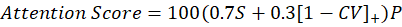 where S=d/29 is the sustained-focus fraction; d is the first slide whose dwell time falls below 60 % of the personal baseline (mean of the first three slides), or 29 if no drop occurs. CV=σ/μ is the coefficient of variation of dwell times up to slide d (a lower CV means steadier reading). [⋅]+=max (0,⋅) prevents negative consistency scores. P is a spam-click penalty based on the share q of slides skimmed in < 1 s: P=1 if q=0; P=0.5 if 0<q≤0.30; P=0.2 if q>0.30.