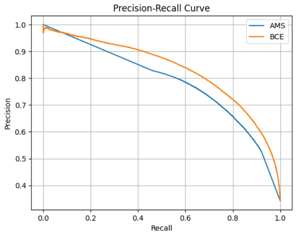 One metric where the AMS-loss model doesn’t perform nearly as well as the BCE-loss model is in their precision-recall curves as seen in Figure 12. The curve for the BCE-loss model bends much more to the top-right of the graph, indicating that the BCE-loss model does much better with imbalanced data.