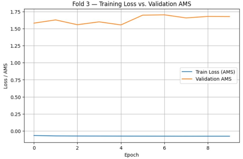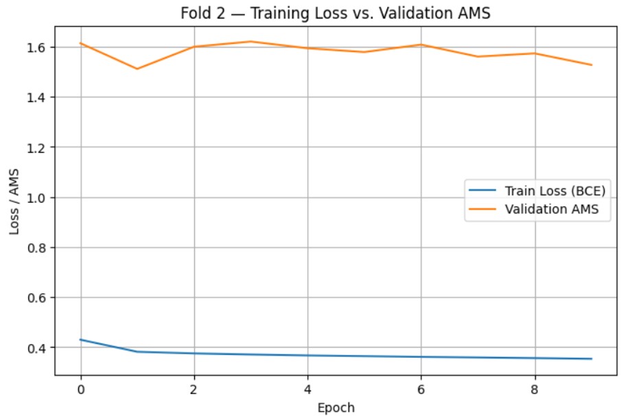 After determining the optimal number of epochs as 10, one final model was trained for both the BCE-loss and AMS-loss using the entire train.csv dataset, with optimized hyperparameters and training time. After generating predictions for each model, they were exported as CSV files and submitted to Kaggle for evaluation. After submission, the AMS scores for both models were as follows: