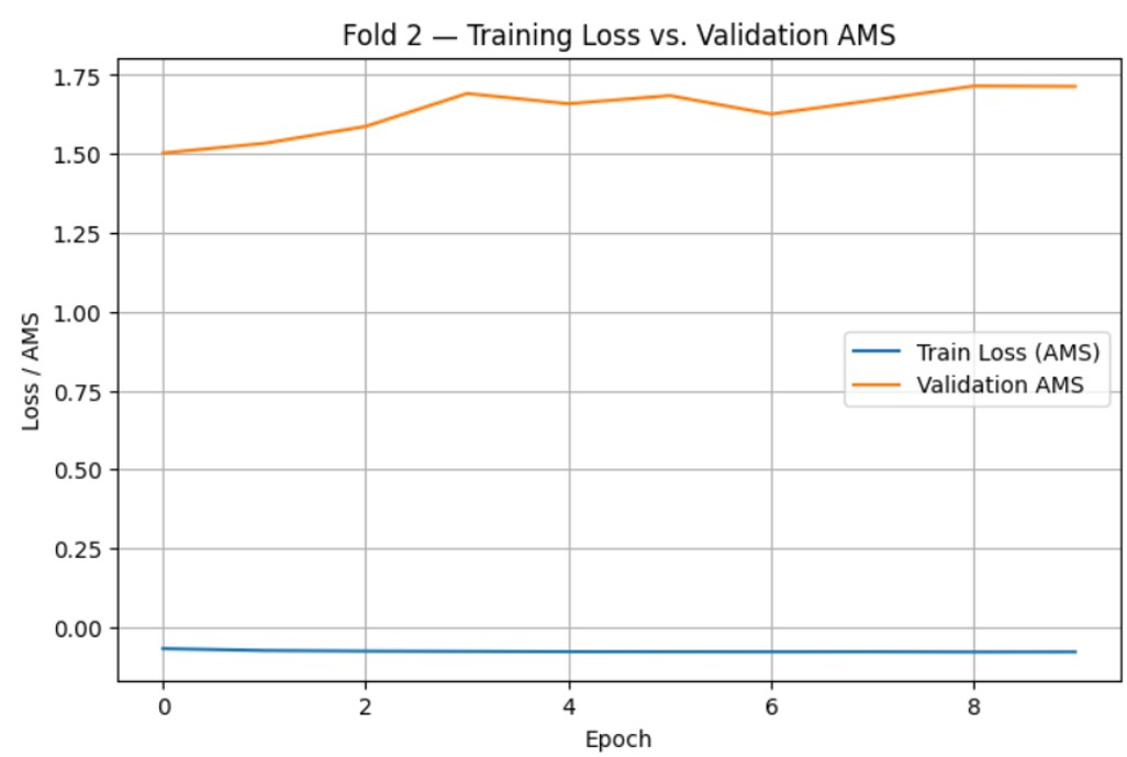 After determining the optimal number of epochs as 10, one final model was trained for both the BCE-loss and AMS-loss using the entire train.csv dataset, with optimized hyperparameters and training time. After generating predictions for each model, they were exported as CSV files and submitted to Kaggle for evaluation. After submission, the AMS scores for both models were as follows: