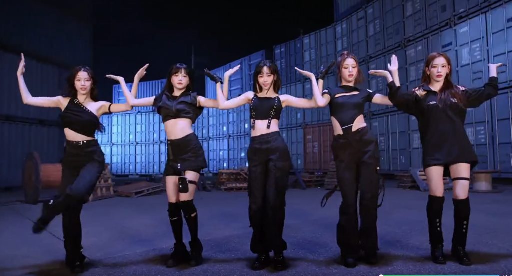 During dance club rehearsals, we often imitate K-Popās wavy moves. Therefore, we analyzed the squatting wave move in LE SSERAFIMās “ANTIFRAGILE”, which appears in the chorus. As shown in Figures 1 to 5, five dancers stand in a row, linking their arms in sequence with one arm each. Then the first dancer raises her right arm horizontally forward. In time with the music, each dancer in turn bends their left leg, while slightly squatting and standing up with their right leg – overlapping at the beginning and end. While squatting, their upper bodies twist in unison to form a wavelike motion, creating a seamless “human wave”. The teamās synchronized movement amplitude and rhythm produce a cohesive, energetic visual effect.