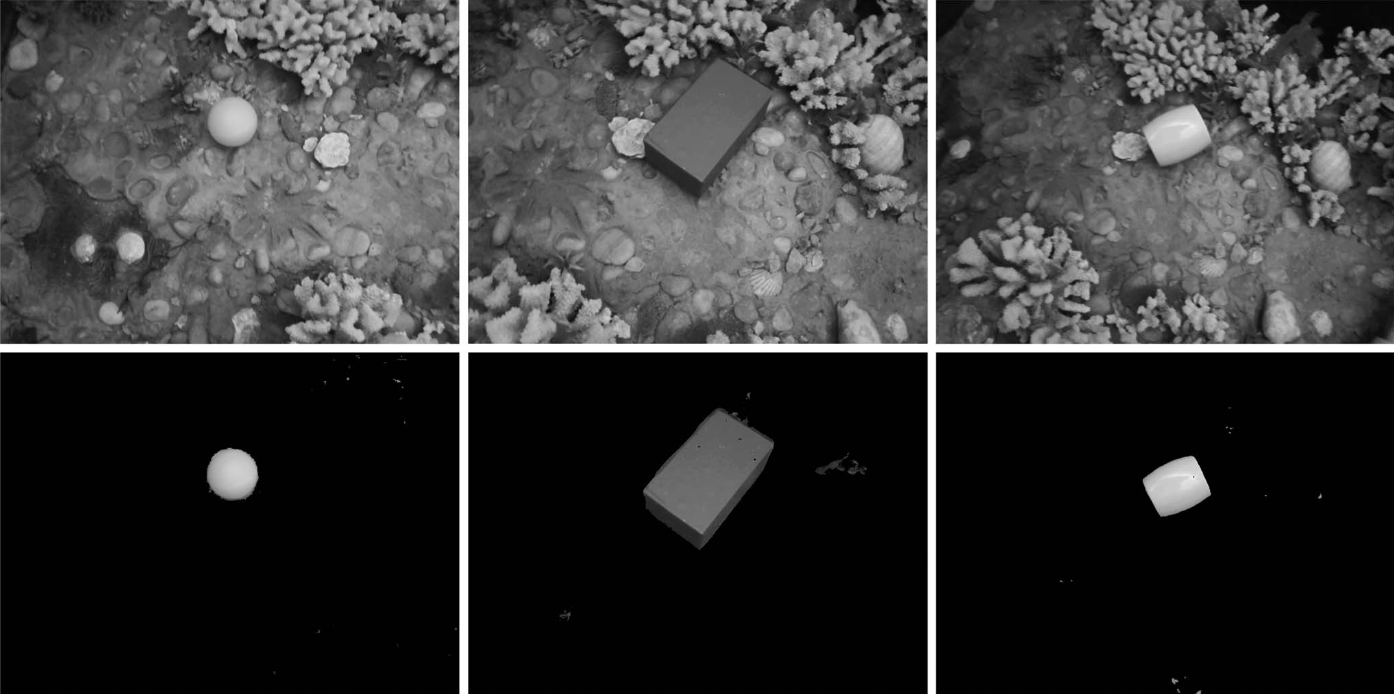 Unlike Ranganathan’s simulation design, Hou’s team used real-world experiments to maximize the accuracy and reliability of their image recognition. The researchers took an image underwater, and its contrast was enhanced and equalized to account for non-uniform lighting. Afterwards, the object of interest was extracted from the environment based on the color differences. An Otsu algorithm was used to remove the background color noise to make clearer distinctions of the targeted object. Finally, a shape-signature-based recognition algorithm determined the shape of the observed object, such as a circle, square, or triangle. To achieve this, the algorithm translated the shape into polar coordinates that are then mapped to determine the number of edges the shape has. The algorithm was then tested by taking photos of objects at the bottom of a 2-meter-deep water tank decorated to resemble a seabed, with sample images illustrated in Figure 3. These are approaches used to mimic real-world situations, enhancing the reliability of the results8.
