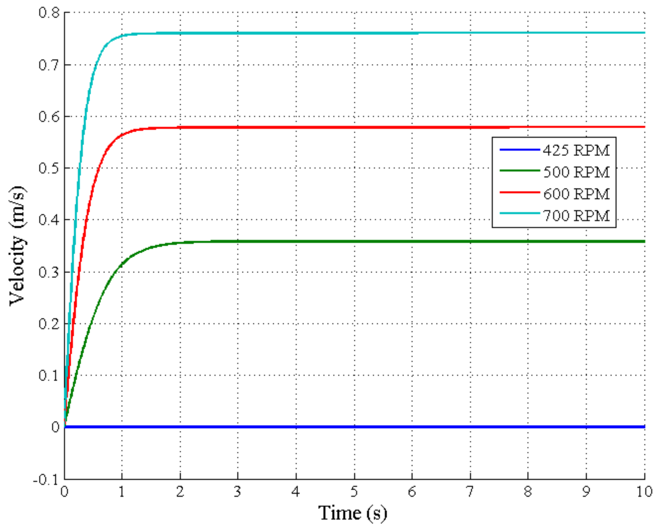 The results Ranganathan collected from the quadra-propeller simulation were generally promising, showing that the robot could accelerate relatively quickly underwater, reaching its maximum speed within a second, suggesting that a quadra-propeller design had high agility. The quadra-propeller can also adjust itself back into the correct orientation after movement, which allows it to maintain stability. However, one issue found was that, because the robot was less dense than water, the buoyancy force is greater than the weight. Therefore, the propellers must spin at 425 rpm to maintain a fixed position, shown by the blue line on the graph in Figure 4. This would result in heavy energy loss just to remain stationary. Consequently, the density of the robot should be as close to that of water as possible when designing quadra-propeller swarms5.
