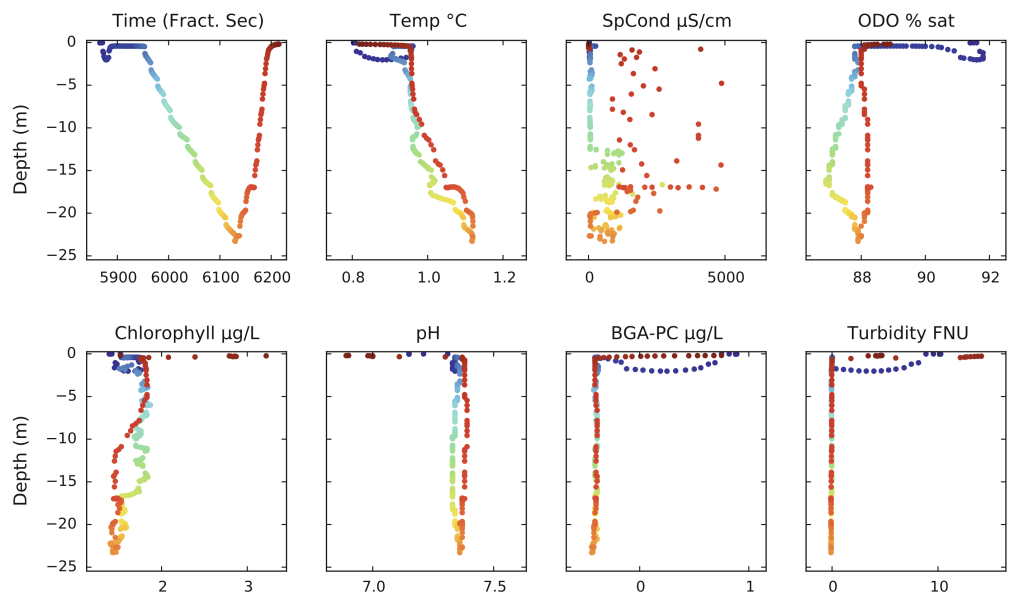 The Vertex robot was designed to be tested in a hardware-in-the-loop system, where a computer simulation creates an imagined underwater environment that the robot then responds to. However, the information transmission to all of the sensors was found to be too difficult to model in real time. Therefore, Schill adapted the testing so that the robot’s microcontroller gave instructions to simulated motors. While this limits the replication of real-world dynamics, Schill’s real-world tests in Lake Onego were also found to be successful, with the robot making measurements while diving 25 meters, which sample results displayed in Figure 6. Observations made by the robot included that temperature increased as water depth increased, while pH and turbidity levels remained constant. The success of the hardware-in-the-loop testing system in these results proved its practicality and effectiveness for future swarm robot tests as well13.