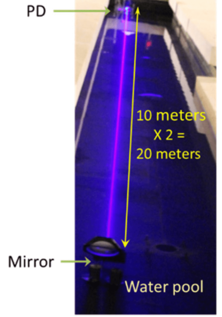 Similarly, Shen’s laser experiment was also done inside a tangible water container, using a 450 nm laser diode emitter and a silicon photodetector as a receiver. The light was flashed at varying distances to mimic the transmission of light underwater. A collimation lens was used on the transmission side to ensure parallel light transmission, and a convex lens was used on the receiving side to focus the light on the silicon photodetector, increasing the intensity of the light received and thus mitigating the absorption of light by water. A spectrometer was also used to determine the rate of transmission at varying wavelengths on the receiving side, which was used to determine the wavelength that is least absorbed by the water medium. The physical experiments again improved the method’s validity and reliability11.