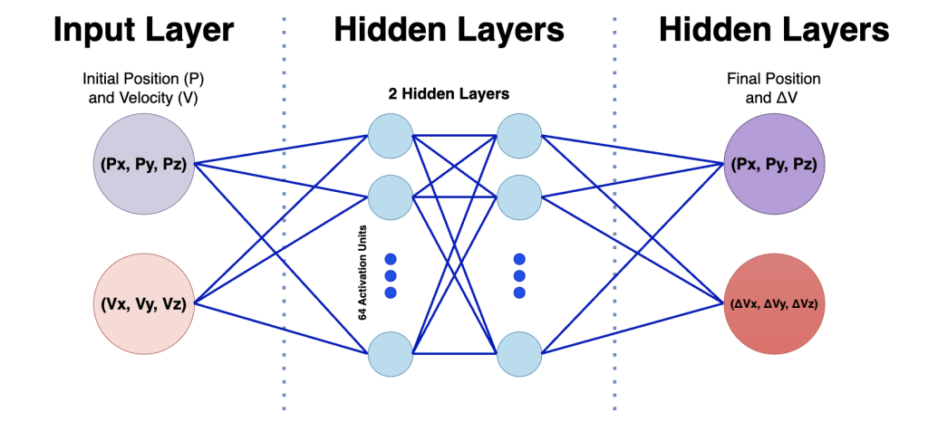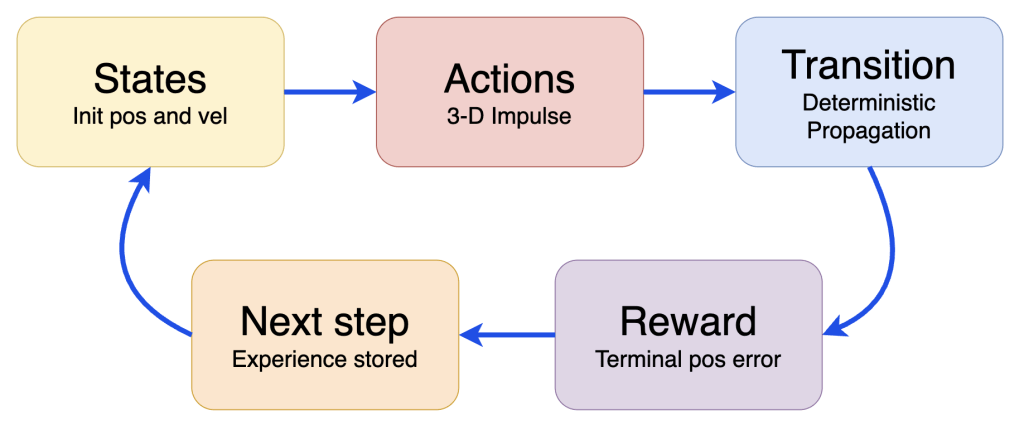 vectors and the time to apply the second burn. The orbits are propagated deterministically– after applying the instantaneous impulse, the RL outputs the final coordinates. Each episode is a MDP.