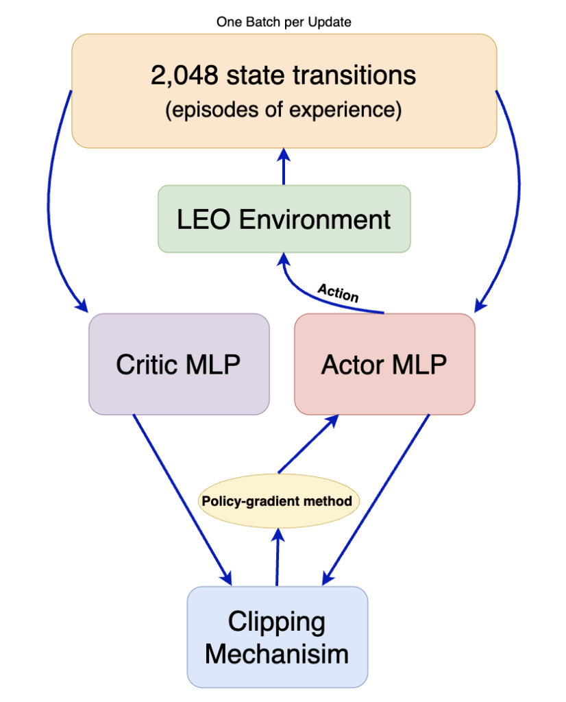 A deterministic two-body environment is implemented for each scenario using the Poliastro libraries to propagate states and ensure the LEO dynamics17. The RL agent is trained in each scenario with a bounded