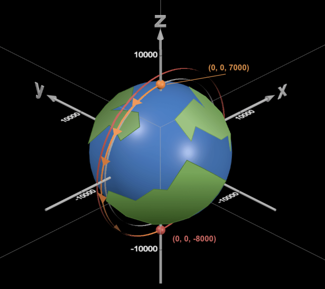 The starting coordinates for scenario two are (0, 0, 6900) in kilometers, with an initial velocity of (-7.58948, 0, 0), which is slightly eccentric, in kilometers per second. The target coordinates are (0, 0, -8200), and the ideal impulse