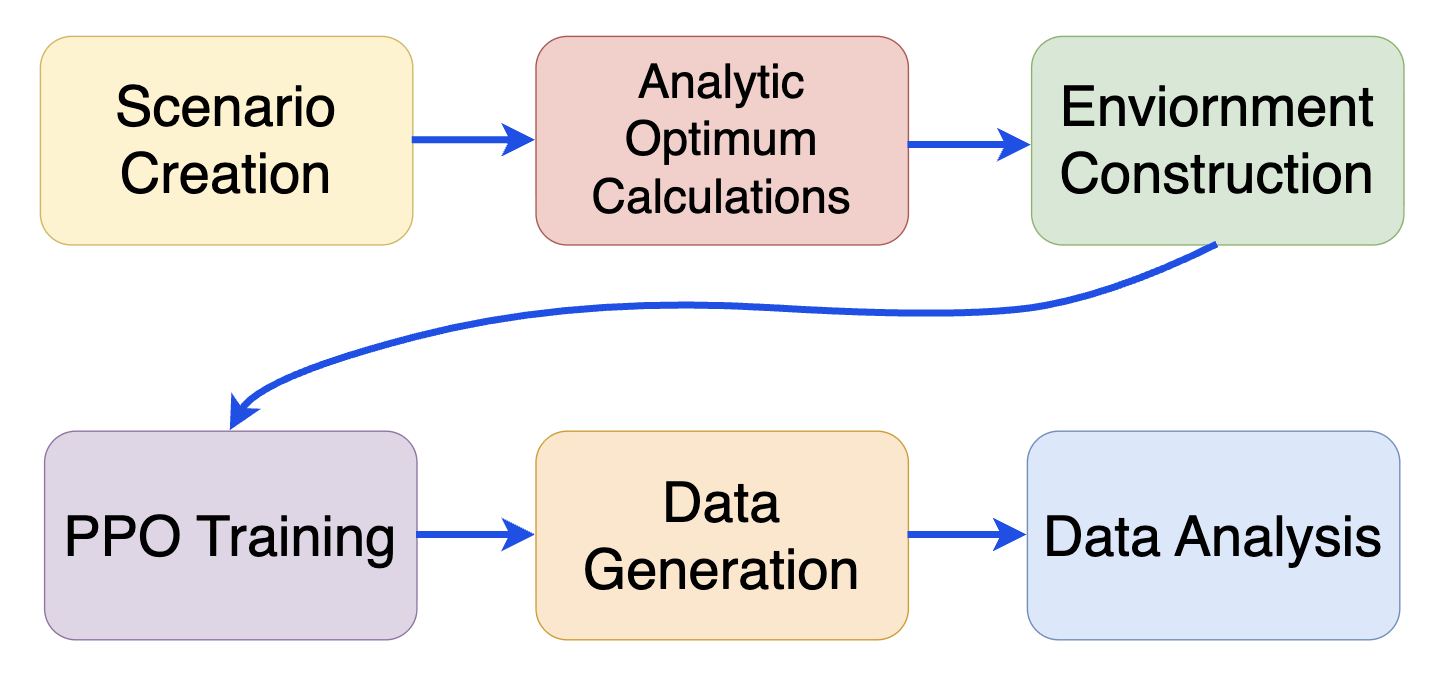 This numerical experiment produces a deterministic two-body orbital mechanics simulation based on Poliastro dynamics17 and utilizes comparative evaluation between RL and MC algorithms. Four orbital transfer scenarios are tested; one through three reflect that of a canonical Hohmann transfer, and scenario four involves multiple burns and a plane change maneuver. The developed RL models’ and MC’s performances are evaluated on analytic optima derived from foundational orbital mechanics equations1. The RL agent is trained with Proximal Policy Optimization (PPO) and Multilayer Perceptron (MLP) architecture. PPO uses a policy-gradient method, actor-critic architecture, and a clipping mechanism to maximize results without diverging too far from the model’s past states18. The process is as follows: set up (scenario creation, idealized burn calculations), RL training and rollouts, MC trials, evaluation through comparison.