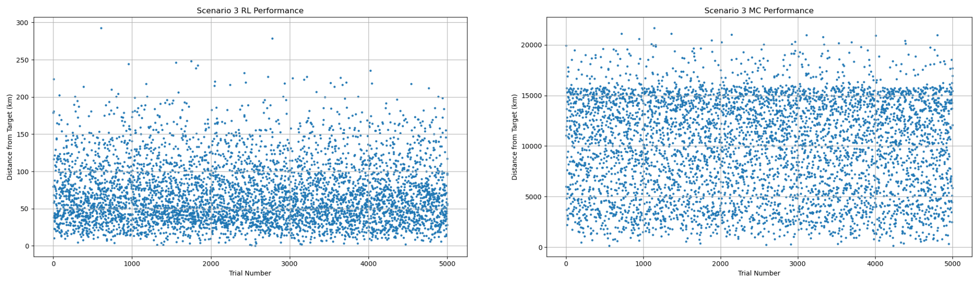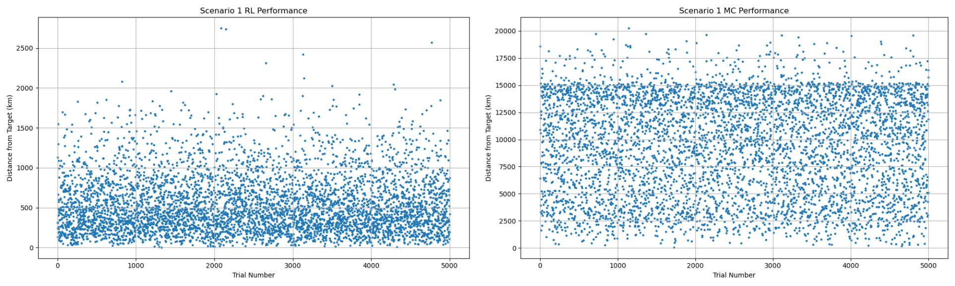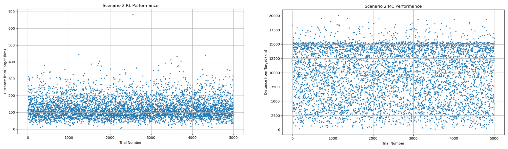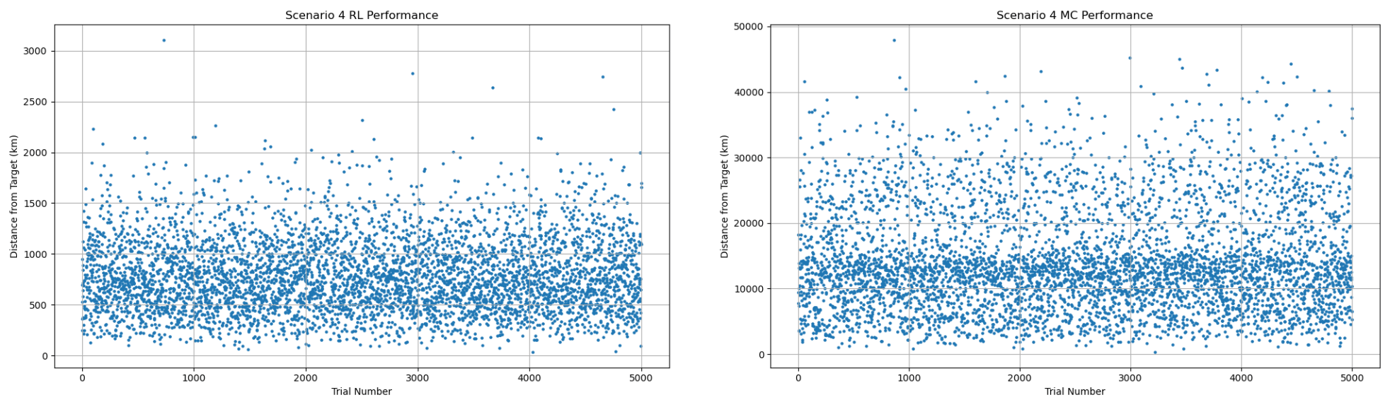 The RL agent consistently outperformed the MC simulation across all four scenarios. The MC matches or outperforms the RL in only 3.125% of cases, and only occurs in scenarios with intentionally limited timesteps. In every instance, across all scenarios, the RL achieved a dramatically lower mean and median terminal position and The RL agent consistently outperformed the MC simulation across all four scenarios. The MC matches or outperforms the RL in only 3.125 % of cases, and only occurs in scenarios with intentionally limited timesteps. In every instance, across all scenarios, the RL achieved a dramatically lower mean and median terminal position and