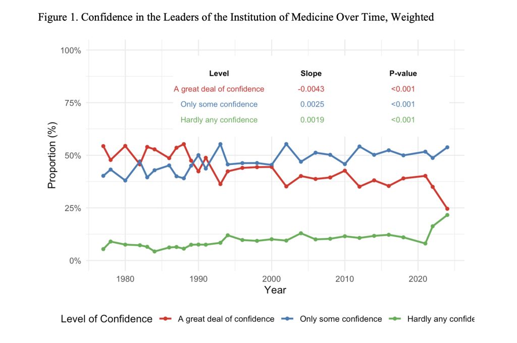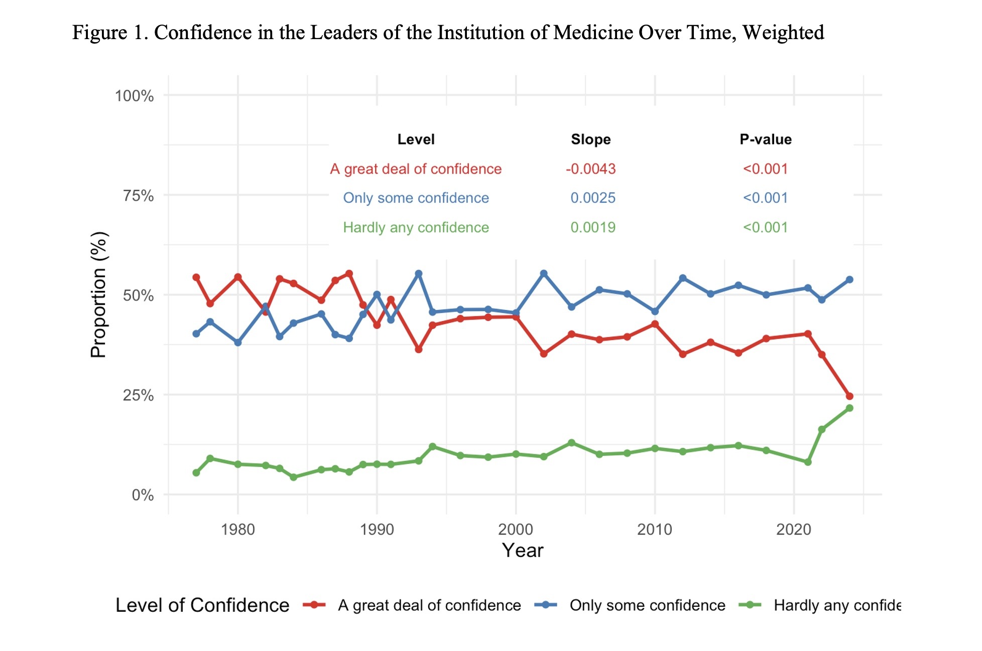 ). The proportion of adults nationally who expressed only some confidence in the leaders of the institution of medicine increased 2.5 percentage points per decade (