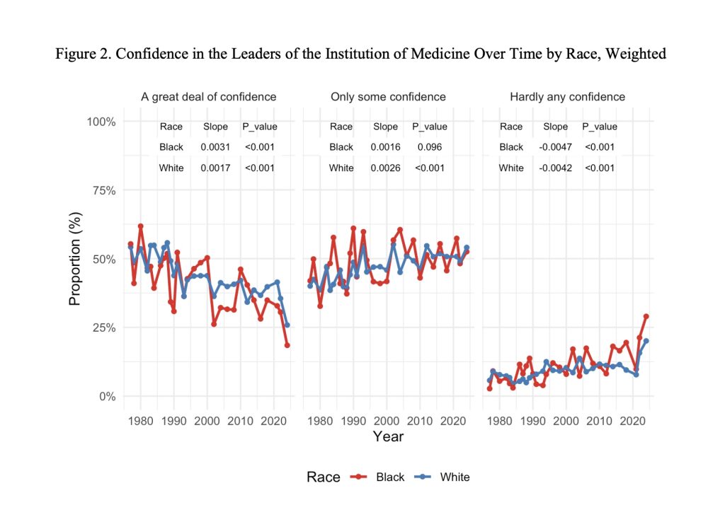 ). The proportion of adults nationally who expressed hardly any confidence in the leaders of the institution of medicine increased 3.1 percentage points per decade for Blacks (