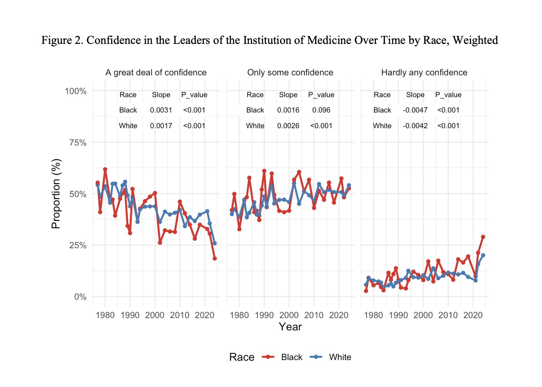 A notable strength of this study is the use of nationally representative GSS data from 1977 to 2024, which allowed us to conduct a robust analysis of long-term trends in institutional trust across racial and sociodemographic groups. However, this study has several limitations. First, this study depends on a single item to measure medical confidence, which may not capture the multidimensional nature of trust, such as trust in doctors versus hospitals, which could produce biased results. Second, the GSS only ascertained White and Black race before 2000. The GSS began ascertaining Hispanic ethnicity and Asian race in 2000. Thus, we were only able to consider these two population subgroups over the full time period. We conducted a secondary analysis based on data from 2000 onward that included additional racial and ethnic population subgroups and reached similar substantive conclusions. Third, the results may be subject to acquiescence bias in which respondents may be more likely to agree with the survey question about trust in the institution of medicine. However, the GSS asked respondents to express their level of confidence and the survey question was agnostic to this level. Fourth, the nearly 6% of respondents were missing values for the race covariate. Our results may be biased if this missing was not missing completely at random80. Finally, the GSS is a cross-sectional study. Future longitudinal-based studies could assess changes in the level of trust over time among the same study respondents to better quantify the effect of specifical temporal events.